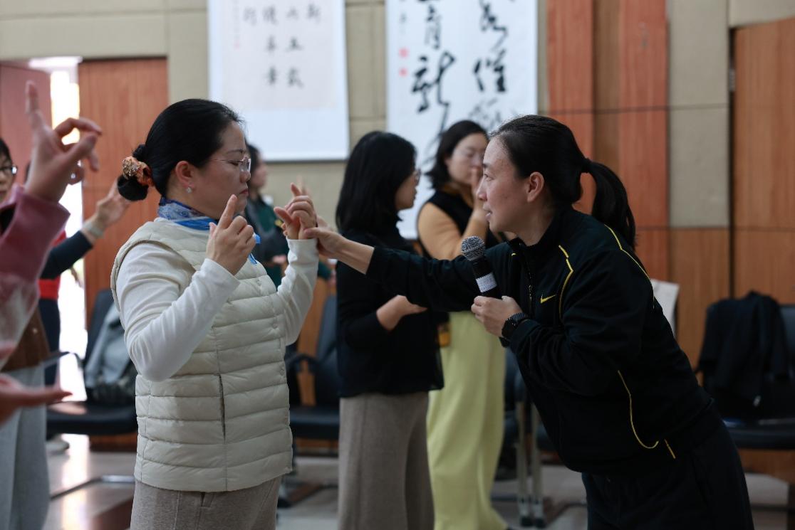 在实践指导环节,刘晓蕾亲自示范全套动作,从起势时的身形站姿,到每一招式的发力要点,均逐一拆解。发现教师动作偏差时,她及时上前纠正,手把手指导细节,帮助大家掌握规范姿势。教师们伴随刘晓蕾的口述引导认真练习,在一招一式中感受传统功法的刚柔之美。答疑阶段,针对“日常练习频次”“动作协调性提升”等疑问,刘晓蕾结合教学经验耐心解答,提供实用锻炼建议。