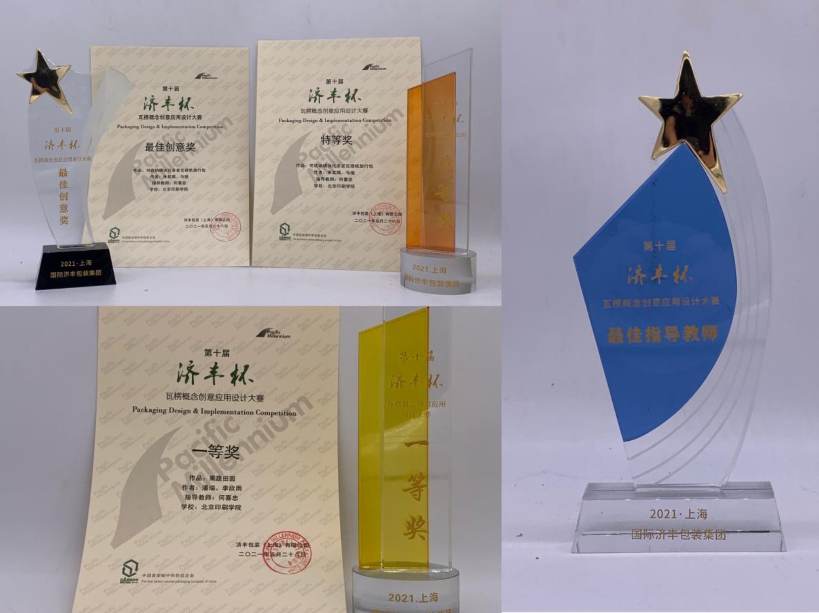 5月27-28日,第十届“济丰杯”瓦楞概念创意应用设计大赛决赛暨颁奖典礼在上海落幕,由廖大智和何喜忠老师指导的18级包装工程专业本科学生朱紫嫣、马璇设计的“可收纳模块化多变瓦楞纸旅行包”夺得本次大赛特等奖及最佳创意奖,18级包装工程专业学生潘瑞、李欣雨设计的“果蔬田园”获得一等奖,何喜忠老师蝉联最佳指导教师奖。