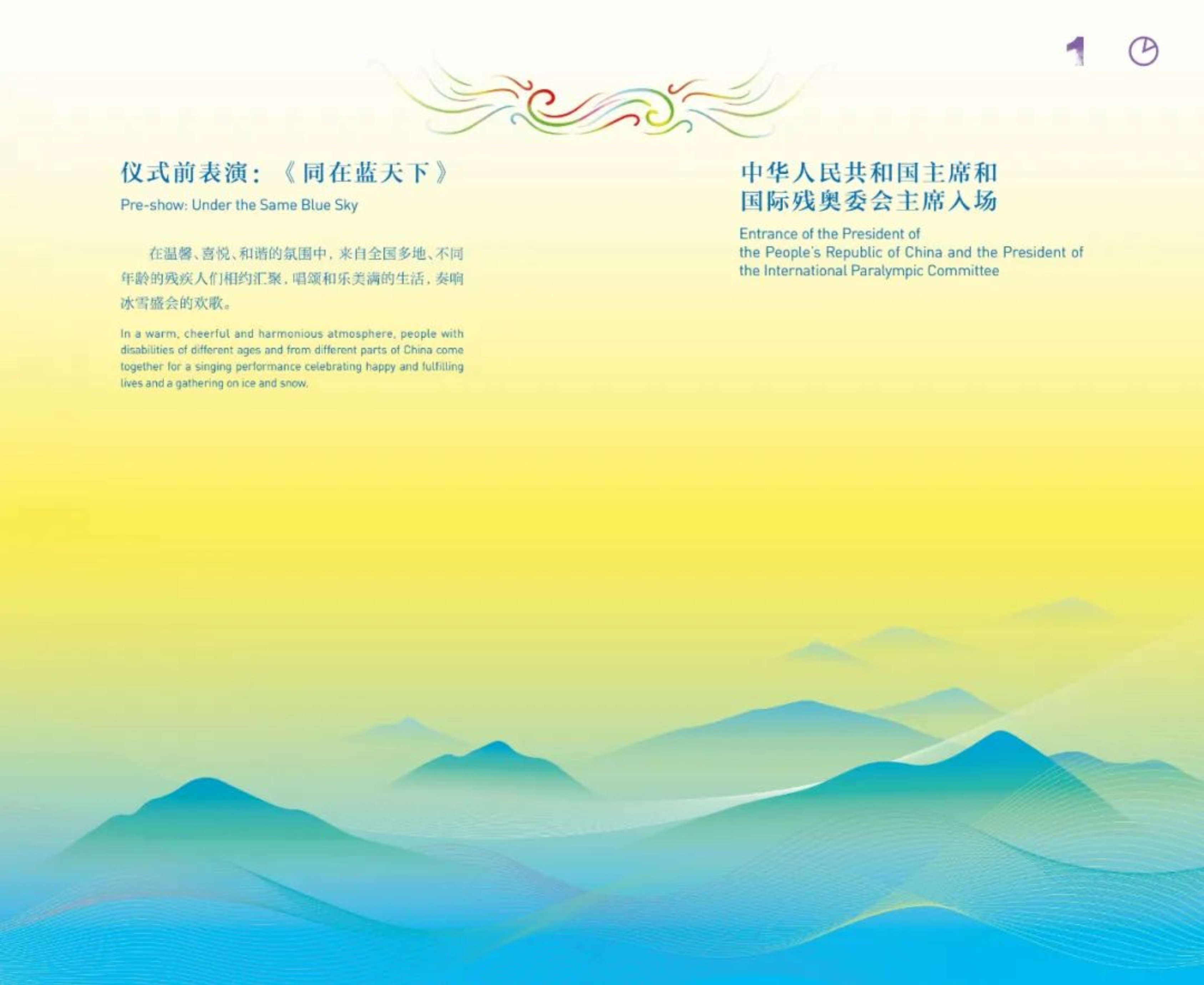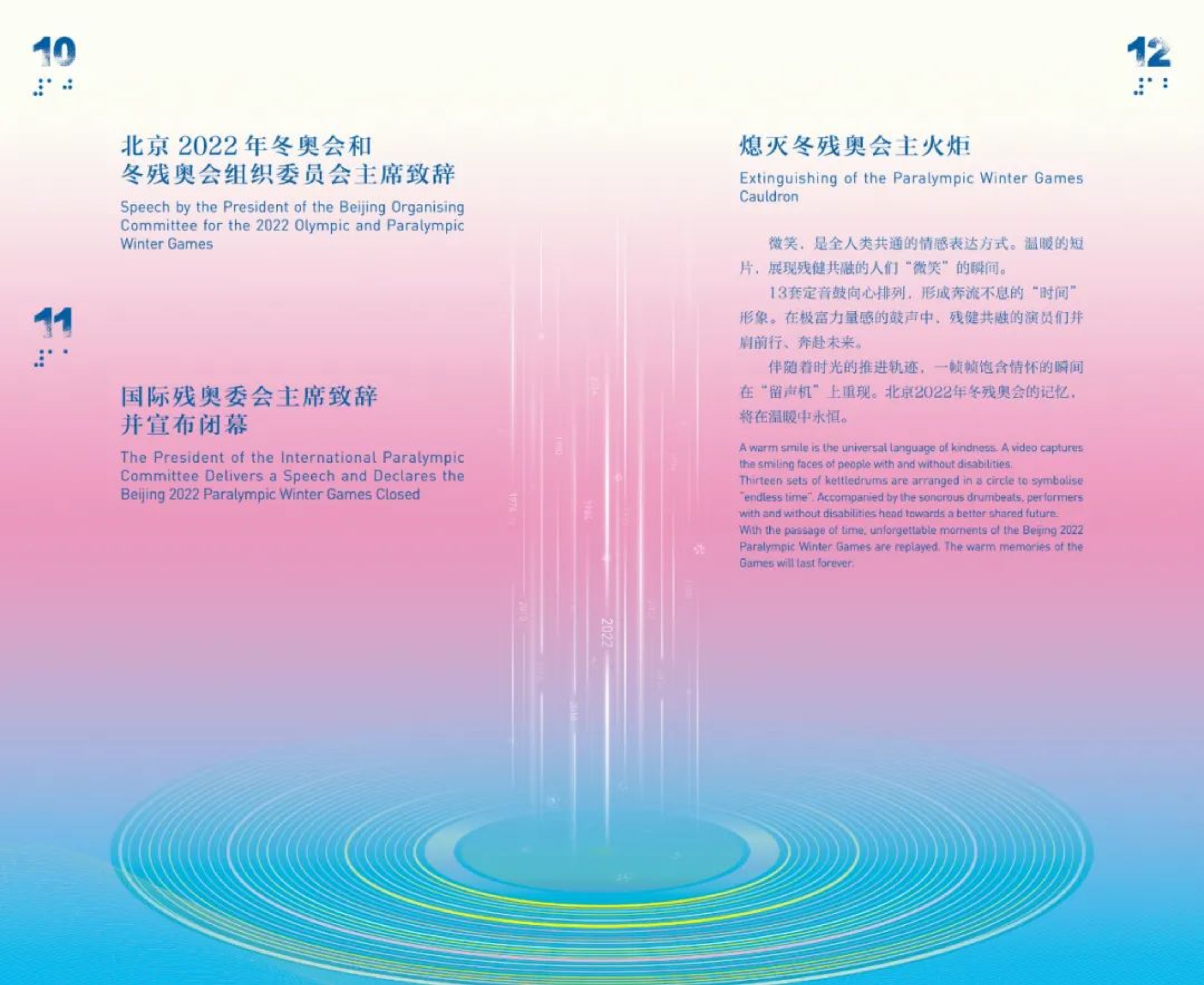 闭幕式手册的设计理念与意象表达,注重与北京冬奥、冬残奥整体设计理念与风格的融会贯通,并在“冬日暖阳”的核心主题与创意体系中不断开拓出崭新的精神意韵。充分了解沈晨导演对冬残奥闭幕式的创意介绍后,设计团队进一步尝试以富有记忆点的核心视觉与符号意象、温暖明亮的整体色彩意象来展现和表达冬残奥精神,深化“勇气、决心、激励、平等”的残奥价值观;与此同时,通过现代而简约的视觉创意语言来展现北京“双奥之城”城市风采与中国奋发向上的民族文化精神。