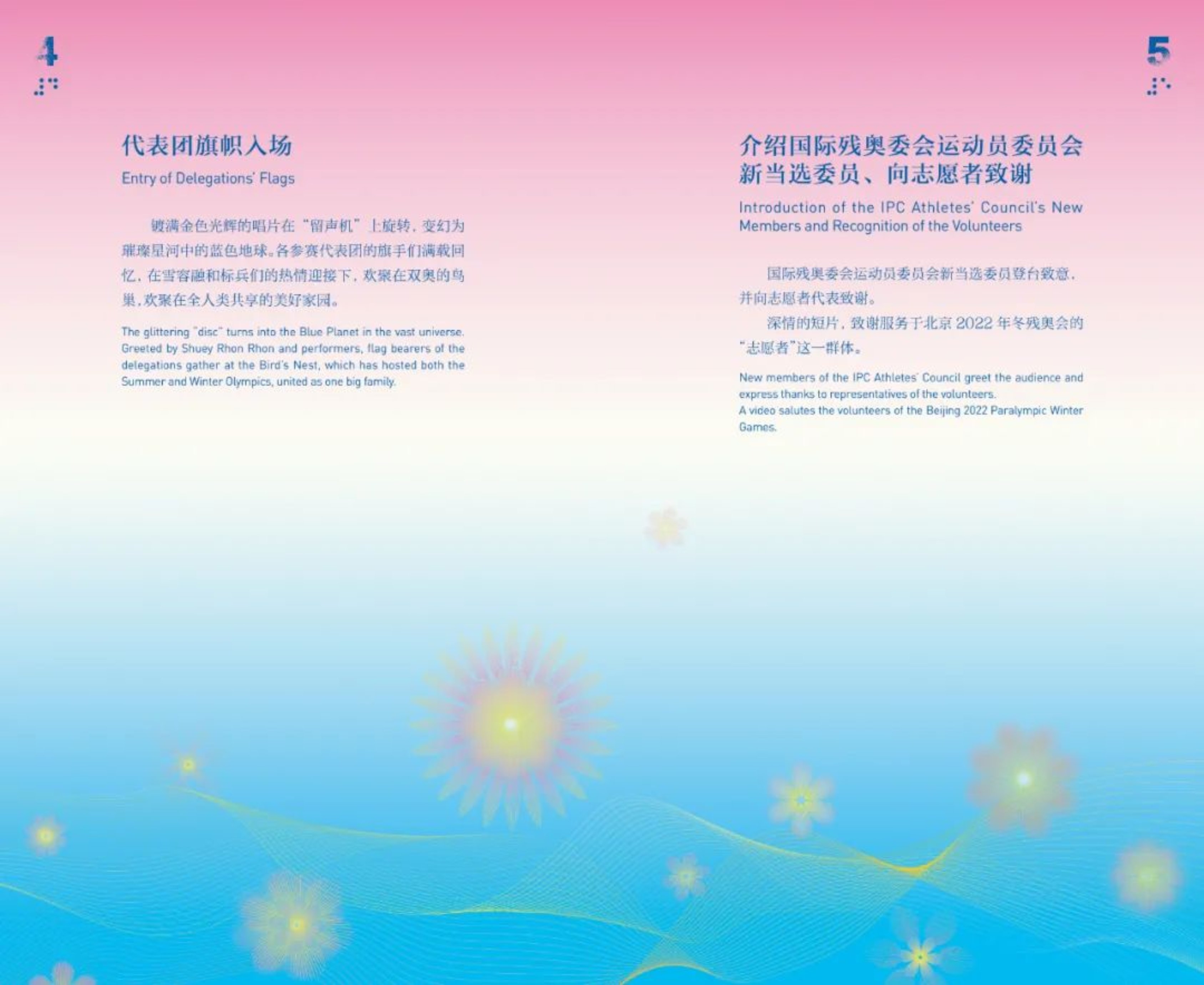 在手册色彩系统的整体把握上,闭幕式手册以冰雪蓝与胭脂粉为主要色彩关系,在象征冰雪运动的冰雪蓝的主色调下,融入了象征温柔、希望、包容与乐观的胭脂粉,整体呈现出时尚、现代而明媚的视觉美感,除此之外,还以云水蓝、丹紫红、宝石蓝、柠檬黄等明亮色彩作为页面辅助色彩体系。整体视觉设计既是残奥价值观的意象性表达,焕发了永动不息的生命活力,也象征了人们对更美好生活、更包容世界的不懈追求。