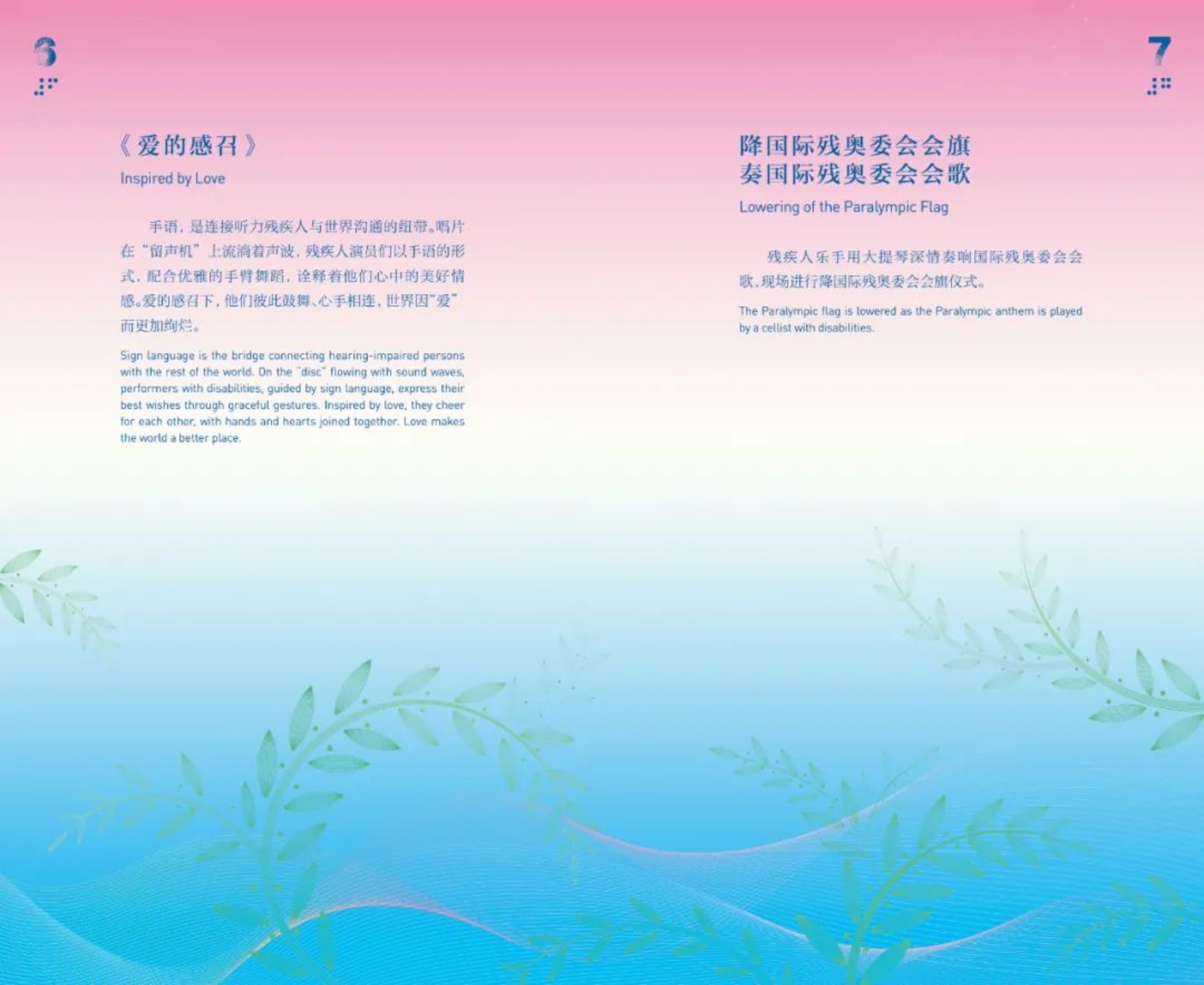 在“爱的感召”页面,设计团队通过对橄榄枝的艺术化处理来体现“爱与和平”的深刻意蕴。在充分理解橄榄枝自然形态的基础上,进行艺术化变形处理,形成了凝炼而富于平衡感的视觉图形,构筑了富于生命哲思的审美意象。橄榄枝的枝蔓顽强地向前伸展,寓意着运动员们奋勇拼搏、自强不息的精神和对“勇气、决心、激励、平等”残奥价值观的完美诠释。
