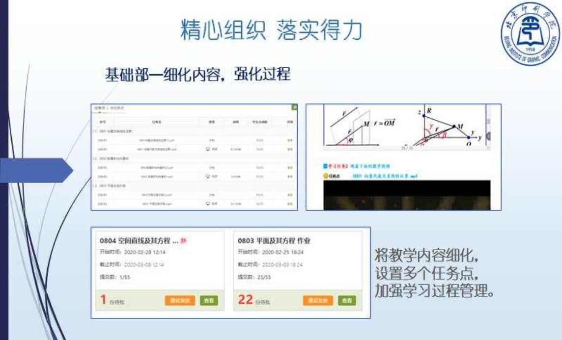 基础部全体教师认真对待网络教学过程管理,努力通过印苑e学堂和学生班级学习群,付出大量时间和精力督促学生按时签到上课,督促学生完成教学任务点、课后作业和参与讨论、答疑等其他教学环节,保证教学质量。