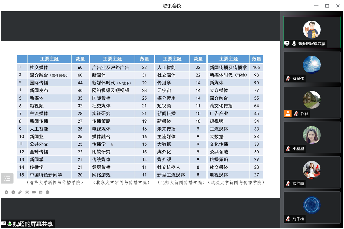 新闻传播学院院长魏超从学科和研究方向的角度分析了中国传媒大学、中国人民大学新闻学院、北京印刷学院、浙江传媒学院等各个学校的优势所在,进而引出对新闻传播学院的科研、学科以及研究生教育等工作的思考。