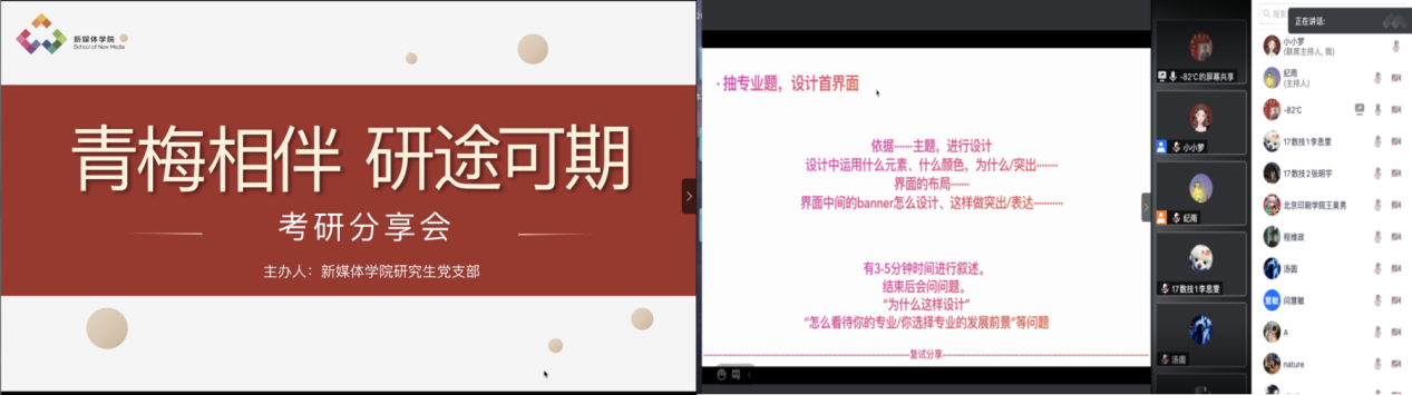 加强学业辅导,发挥朋辈引领作用。为增强学生考研信心,积极回应同学们的需求,3月24日,学院研究生党支部以线上会议形式举办本学年第三场“青梅相伴 研途可期”考研分享会,邀请2020年成功考取硕士研究生的同学从复试准备、线上候考程序、常见英文问答、专业考核要点等方面进行了分享和答疑,帮助同学们明确目标,增强信心,合理备考。