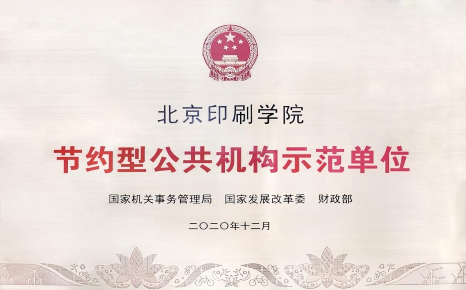 2020年12月,国家机关事务管理局、国家发展改革委、财政部联合印发了“关于公布2019-2020年节约型公共机构示范单位和能效领跑者名单的通知”,确定表彰全国1506个单位为示范单位,192个单位被授予“能效领跑者”。此次共有两所北京市属高校荣获国家级“节约型公共机构示范单位”称号,北京印刷学院为其中之一。2021年4月8日,在北京市机关事务管理局召开北京市公共机构能源资源节约和生态环境保护工作会议上,相关部门向学校颁发了奖牌、证书。