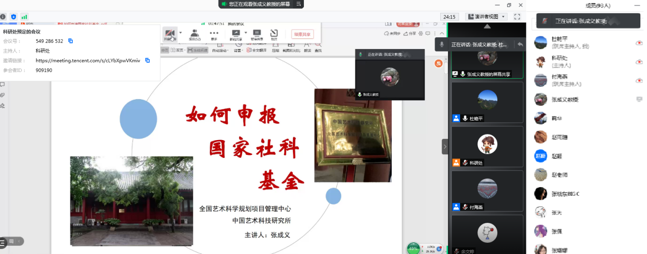 1月21日上午,科研处和设计艺术学院邀请青岛大学张成义教授为学校教师作本年度第六场国家基金类科研项目申报辅导讲座:如何申报国家社科基金。讲座由科研处处长杜艳平主持,学校近百位老师通过腾讯线上会议方式聆听了本次讲座。