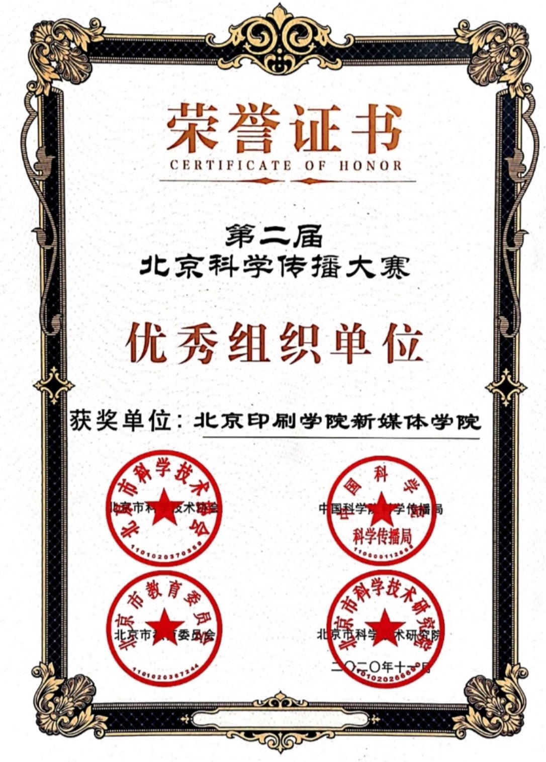 12月13日,由北京市科学技术协会、中国科学院科学传播局、北京市教育委员会、北京市科学技术研究院联合主办的第二届北京科学传播大赛颁奖活动在北京科学中心隆重举行。学校新媒体学院学生胡潇予、王迎的作品《客至草原》,栾雨桐、刘小草、王茜濛、李宇桐、雷邬雅彤的作品《生灵之殇》荣获科普动画类一等奖,《猴超值》《伞为媒》《共抗疫情》《征途》作品荣获科普动画类二等奖,《传染》《致九零》《等你回家》《抗击疫情从我做起》《抗疫》等12件作品荣获科普动画类三等奖,《科技让我们“走”得更远》《它让我们都一样》荣获科普漫画类二等奖,《VR-智爱生活·你我近在咫尺》荣获科普漫画类三等奖,新媒体学院教师王斐荣获优秀指导教师奖,新媒体学院荣获优秀组织单位。