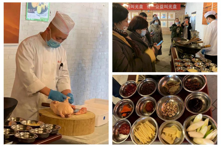 学校食堂厨师现场教学鸭子的两种烹饪方法,从分切开始,细心讲解每一个步骤。现场老师不时提出自己的疑问,并将每一步烹饪过程包括加入的调料都拍照记下。最后现场大家共同评鉴厨师的精美厨艺。