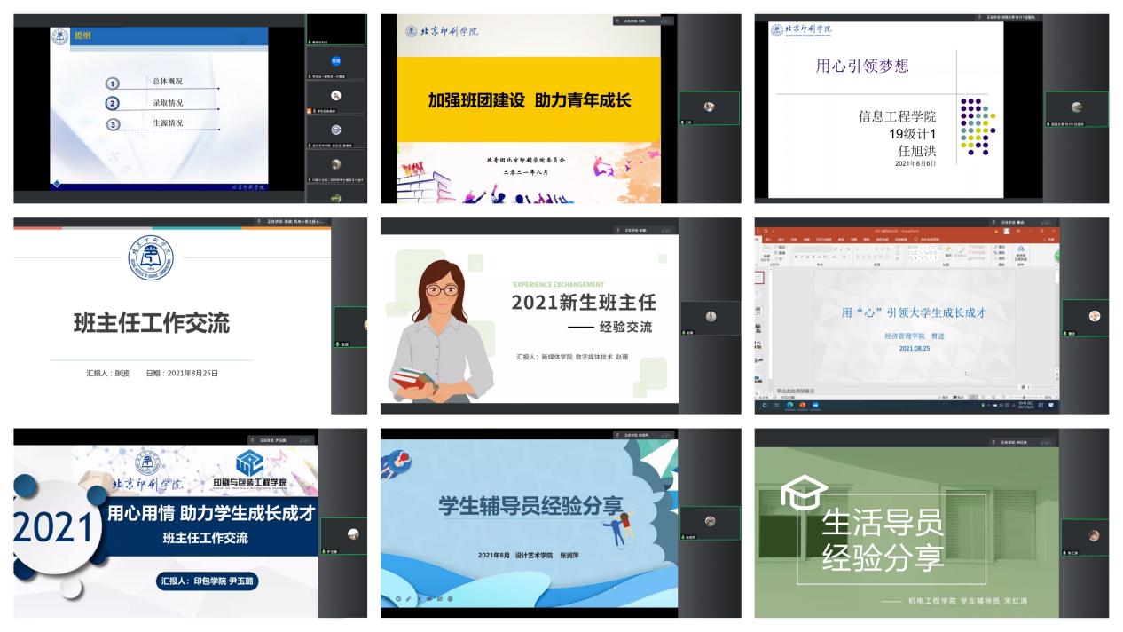 信息工程学院学生干部李润昊和班主任任旭洪,新闻出版学院班主任张波、新媒体学院班主任赵珊分别代表2020年优秀班集体、班主任交流了班级特色建设、管理心得和成功经验;经济管理学院曹进和印刷与包装工程学院尹玉璐代表优秀辅导员围绕学生工作的重点方面和重点任务,特别是做好新时代大学生思政工作方面的探索和实践,交流了体会和感悟;设计艺术学院张润萍、机电工程学院宋红涛代表学生辅导员交流了工作和收获。