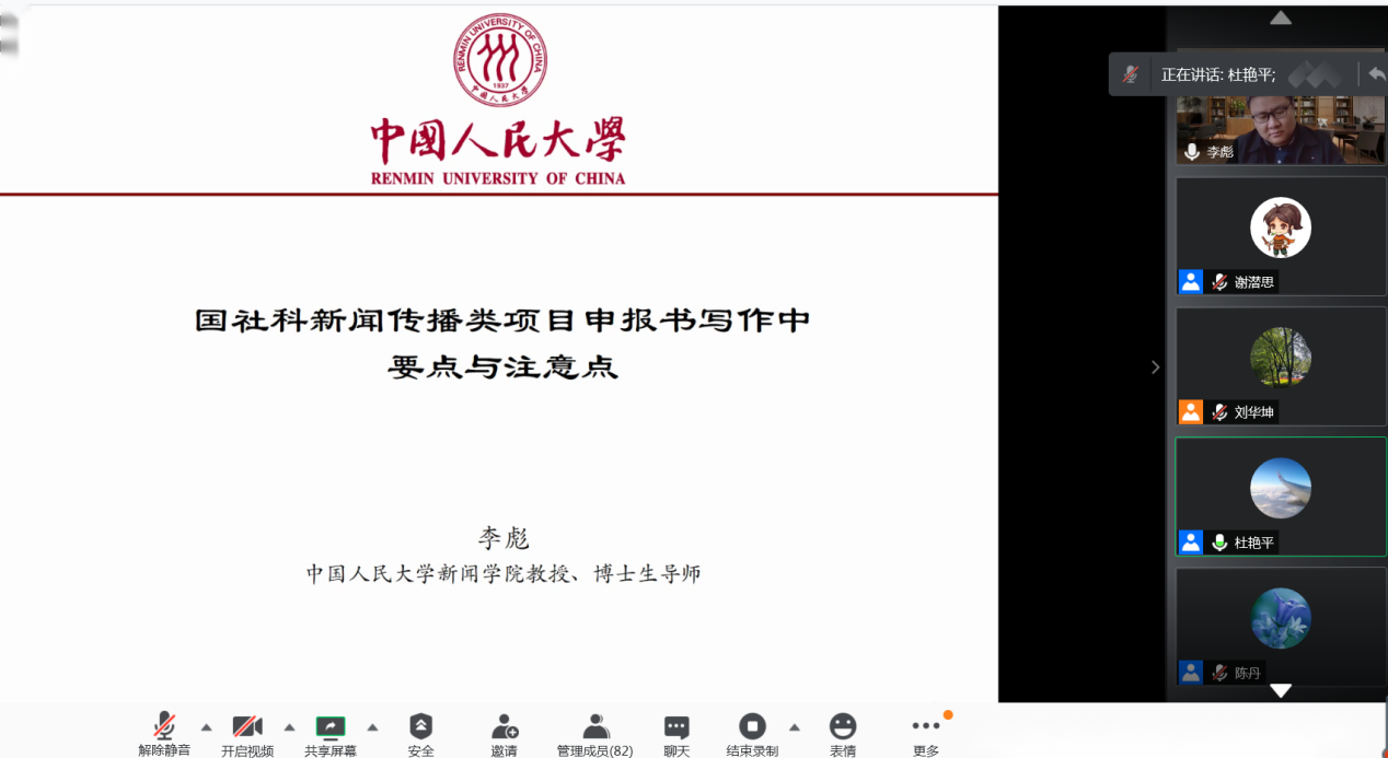 2月4日上午,科研处和新闻出版学院邀请中国人民大学新闻学院李彪教授为学校教师作第七场国家基金类科研项目申报辅导讲座:国社科新闻传播类项目申报书写作中的要点与注意点。此次讲座是在前期辅导讲座基础上,根据老师们的反馈,开启的第二轮专题辅导,讲座结合不同学科的特点,更加聚焦老师们的需求,针对性更强。此次讲座由科研处处长杜艳平主持,新闻出版学院执行院长陈丹致辞,全校八十余位老师通过腾讯线上会议方式聆听了本次讲座。