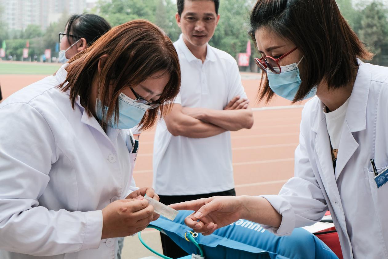 早在运动会开始之前,校医务室就已经开始了紧锣密鼓的准备工作。校医室杨秀丽医生和程丽医生说:“针对关节肌肉类受伤,我们准备了绷带、固定支具等;针对心肺功能方面,我们准备了氧气袋等……尽量在医务保障方面做到尽善尽美。”