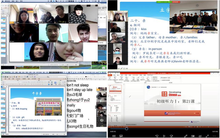 2月17日,国际教育学院2020年春季学期对外汉语课程如期线上开课。直播、录课、视频会议、在线答疑等多种网络教学模式让身处世界各国的北印学子相聚“云”课堂,实现停课不停学,停课不停教。三周以来,国教院开设预科生对外汉语课程8门次,本科对外汉语课程2门次,研究生对外汉语课程1门次,尼泊尔进修生对外汉语课程2门次,汉语言生课程8门次,共计21门次。任课教师根据课程内容与特点选择适当的授课方式。任课教师以网络直播课程为主,采用包括腾讯会议、Zoom、Ez talk等平台,并配合微信群或公共邮箱资料上传学习资料(课件、音频、电子笔记)。有些课程采取录课的方式,供不方便直播的学生参与。课程结束后,教师们在线布置作业,批改后在线反馈学生,并及时解答学生的疑问。针对时差问题,授课教师根据每个学生实际情况,协调全班学生上课时间。