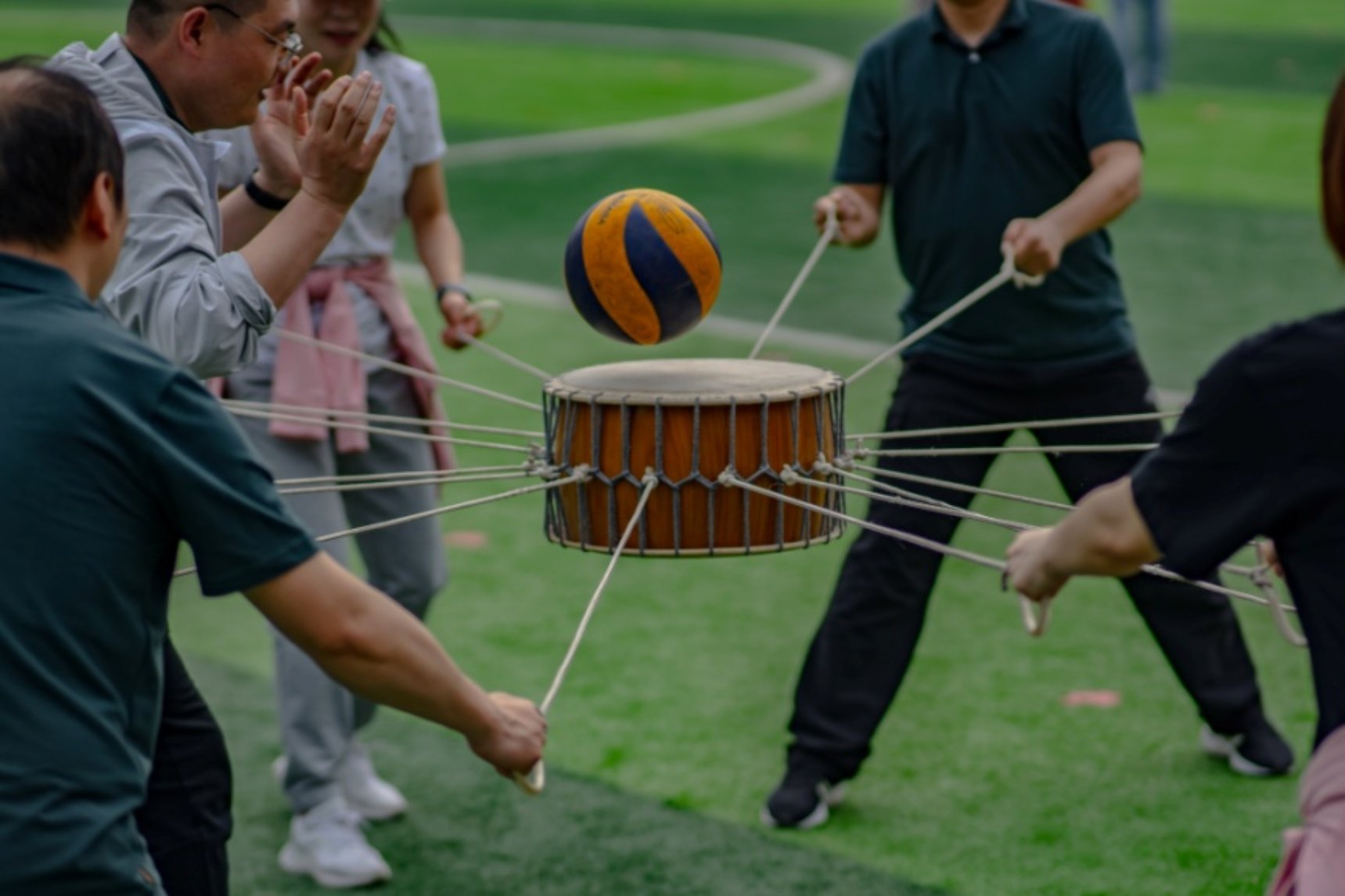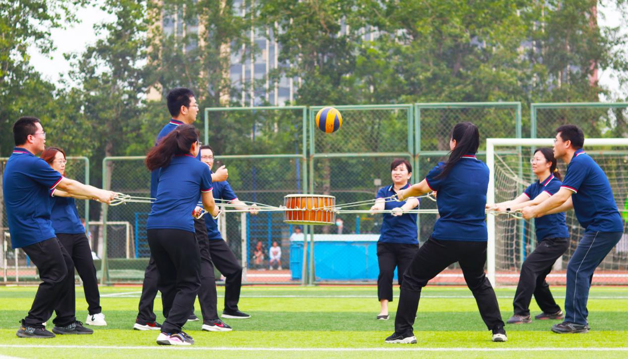 击鼓颠球是教职工趣味运动会中最需团结协作的项目之一。这一项目需要八位运动员配合用八根绳子从不同方向将中间的鼓拉起,共同拉动绳子进行颠球。老师们认真专注,享受着团队合作带来的乐趣。