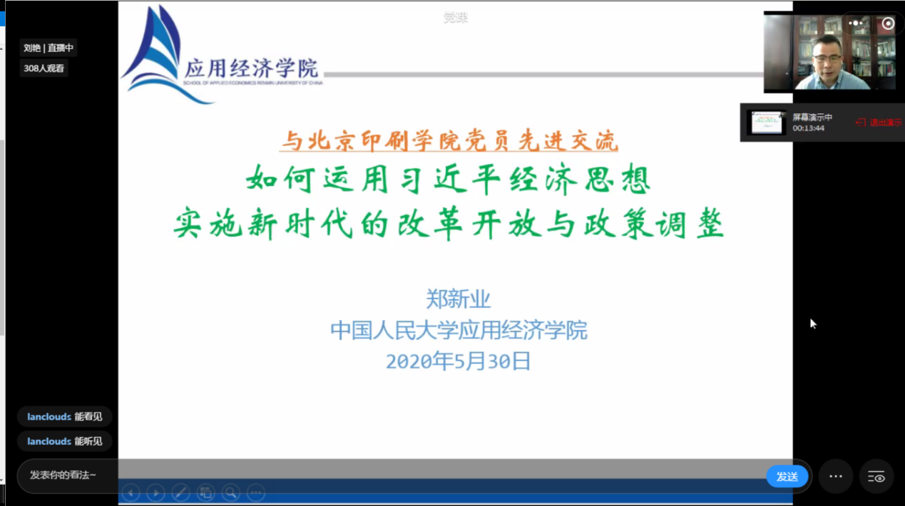 5月30日上午,学工部通过企业微信视频直播的形式组织第69期入党积极分子党课培训集中学习。中国人民大学应用经济学院院长郑新业教授应邀作“如何运用习近平经济思想实施新时代的改革开放与政策调整”专题辅导报告。300多名学生入党积极分子参加了本次集中学习。