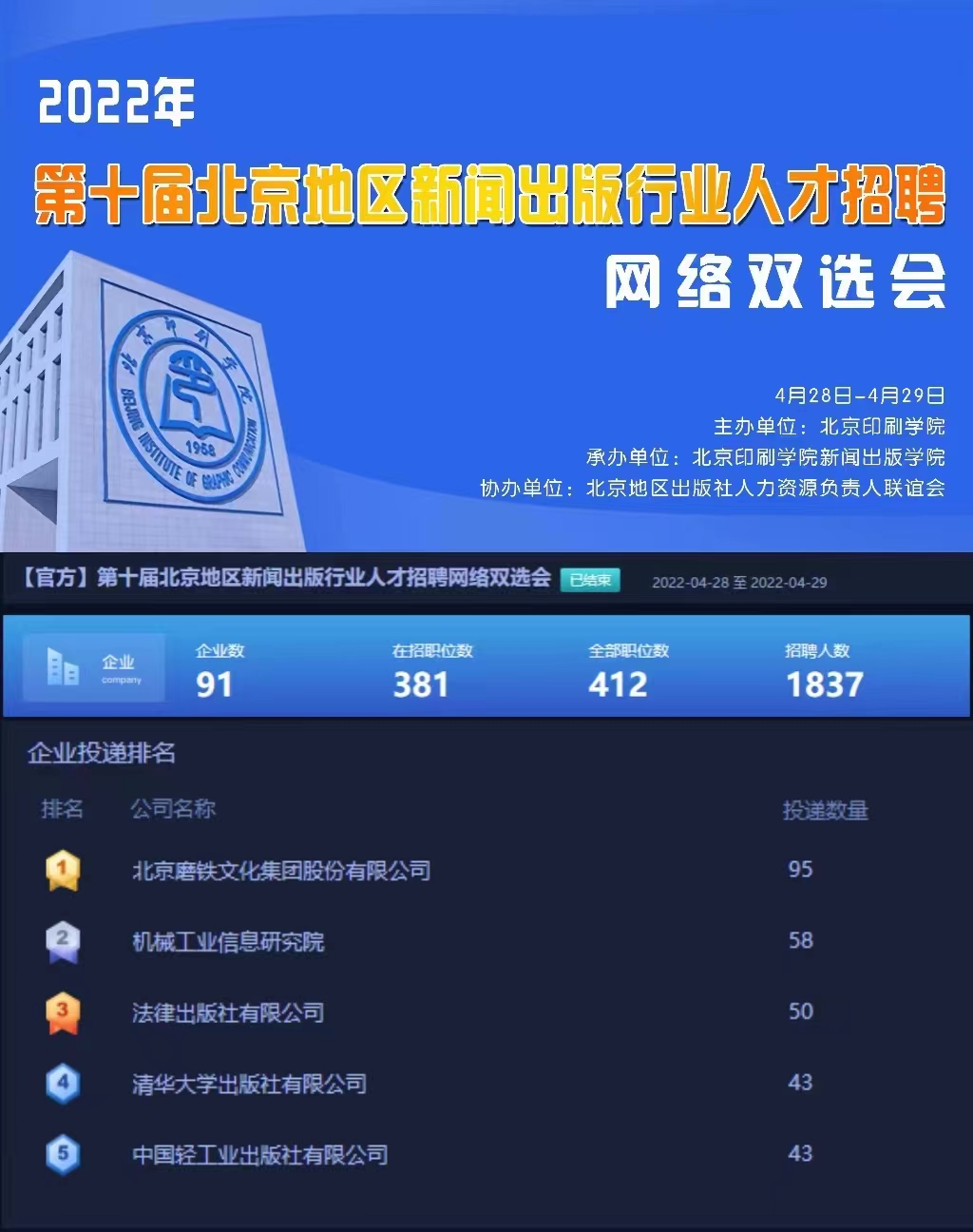 4月28日至29日,“第十届北京地区新闻出版行业人才招聘会”在线上举办。招聘会由北京印刷学院主办、新闻出版学院承办、北京地区出版社人力资源负责人联谊会协办。91家知名企事业单位参加招聘会,提供职位数422个、招聘人数1847人。招聘会坚持“服务北京、面向全国;聚焦行业、质量优先;融会贯通、促进发展”办会思路,将办好招聘会作为服务党和国家重大决策、深化校企高度互信合作、推动毕业生高质量就业的重要举措。