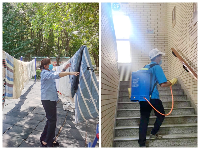 学生公寓利用假期完成了本校区、北校区2261套宿舍家具床的更换。为了完成家具更换工作,值班员通宵达旦,整宿坚守在岗位,配合施工人员在夜间卸车并进楼安装家具;完成422间新生宿舍的粉刷施工,配置新生宿舍基本设施的维修和迎新物品,铺装新生床垫2199张,安装固定宿舍书桌电源插线板2004个;为学生宿舍晾晒潮湿被褥78床,开窗通风8000多间次。