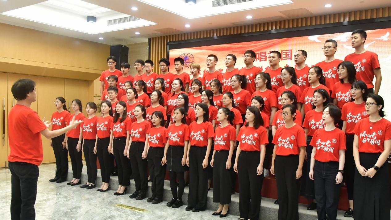 大会最后举行“永远跟党走”歌曲传唱活动,新入职教职工与学生合唱团共同唱响《歌唱祖国》。