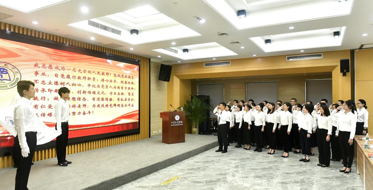 新入职教职工庄严宣誓:“我志愿成为一名光荣的人民教师!忠诚党的教育事业,自觉履行教师职责;潜心治学、锐意创新,不忘立德树人初心,牢记为党育人为国育才使命;传承印刷文明,创新传媒文化,守正出新、笃志敏行;做有理想信念、有道德情操、有扎实学识、有仁爱之心的好老师,为建设特色鲜明、高水平出版传媒大学而努力奋斗!”