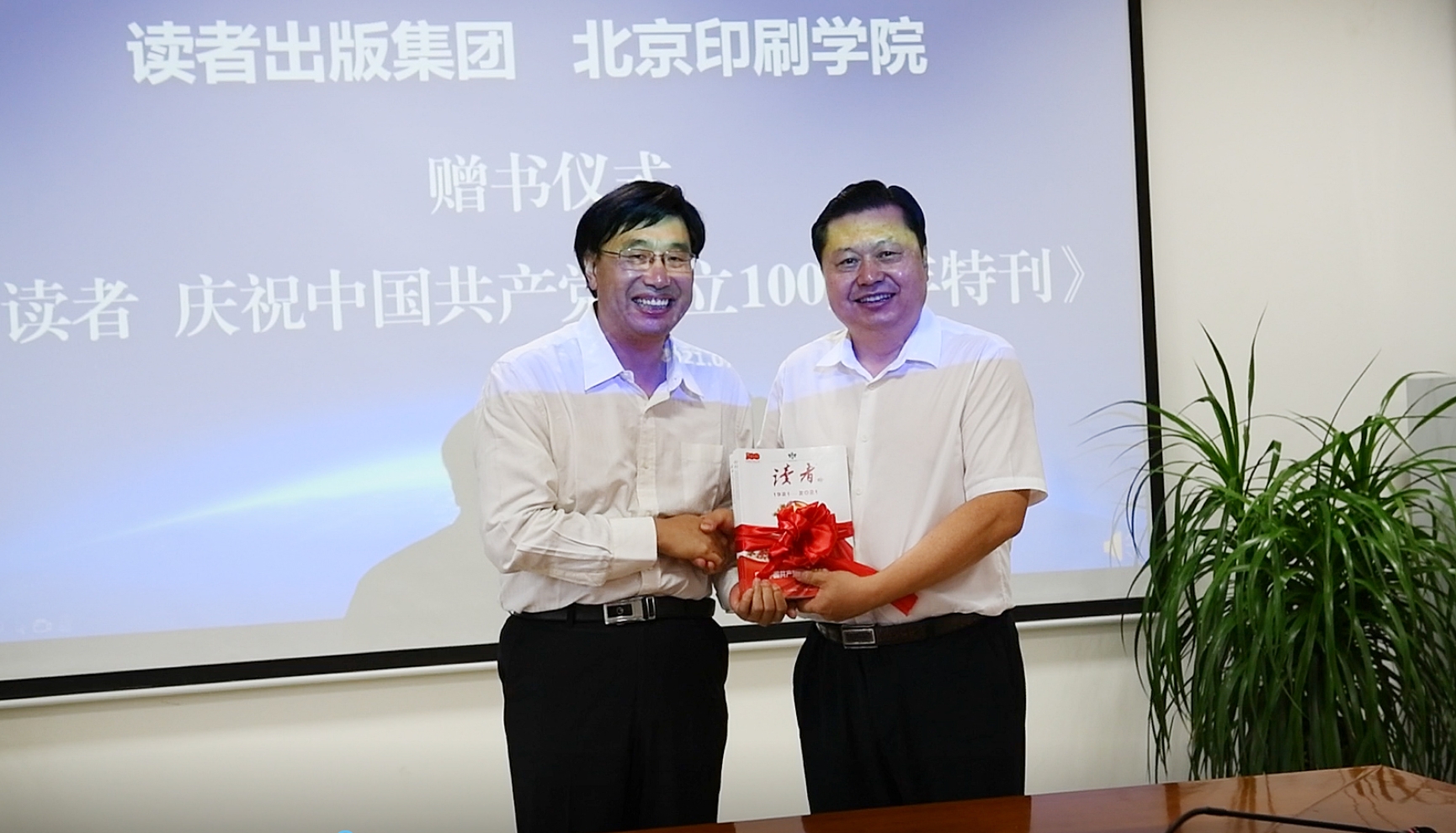 王关义代表学校赠送聚焦读者出版集团典型案例的《传统出版融合发展的路径与对策研究》和《出版管理概论》两部著作,刘永升代表读者出版集团向学校赠送《读者·庆祝中国共产党成立100周年特刊》。