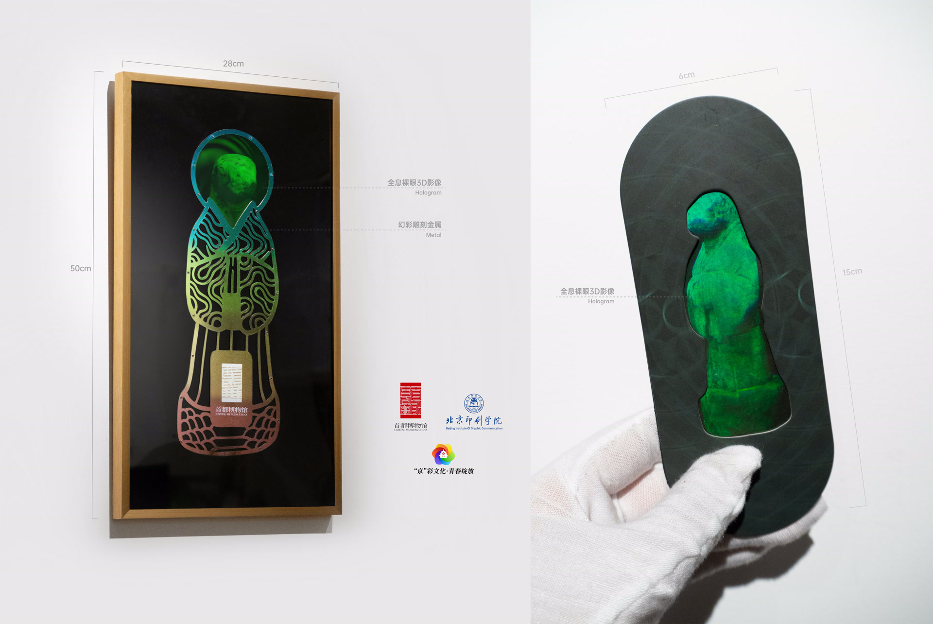 “在不佩戴任何观看设备的情况下,透过一片薄膜,就能看到立体蛇头,调整视线角度,还能观看蛇头舞动。观众拿着配有薄膜的文创艺术品,仿佛身处博物馆展厅里,就像站在唐石刻十二辰蛇像文物前。”北印全息艺术实验室主任王硕揭秘,文创的技术核心之一就是一片厚度仅有15微米的超高分辨率薄膜。师生们运用数字化全息、幻彩金属雕刻、光学色彩、立体三维重建等技术,将文物的二维图像转换成全息三维语言,通过光的干涉原理与数字化计算,在膜片上记录并再现文物三维形象。
